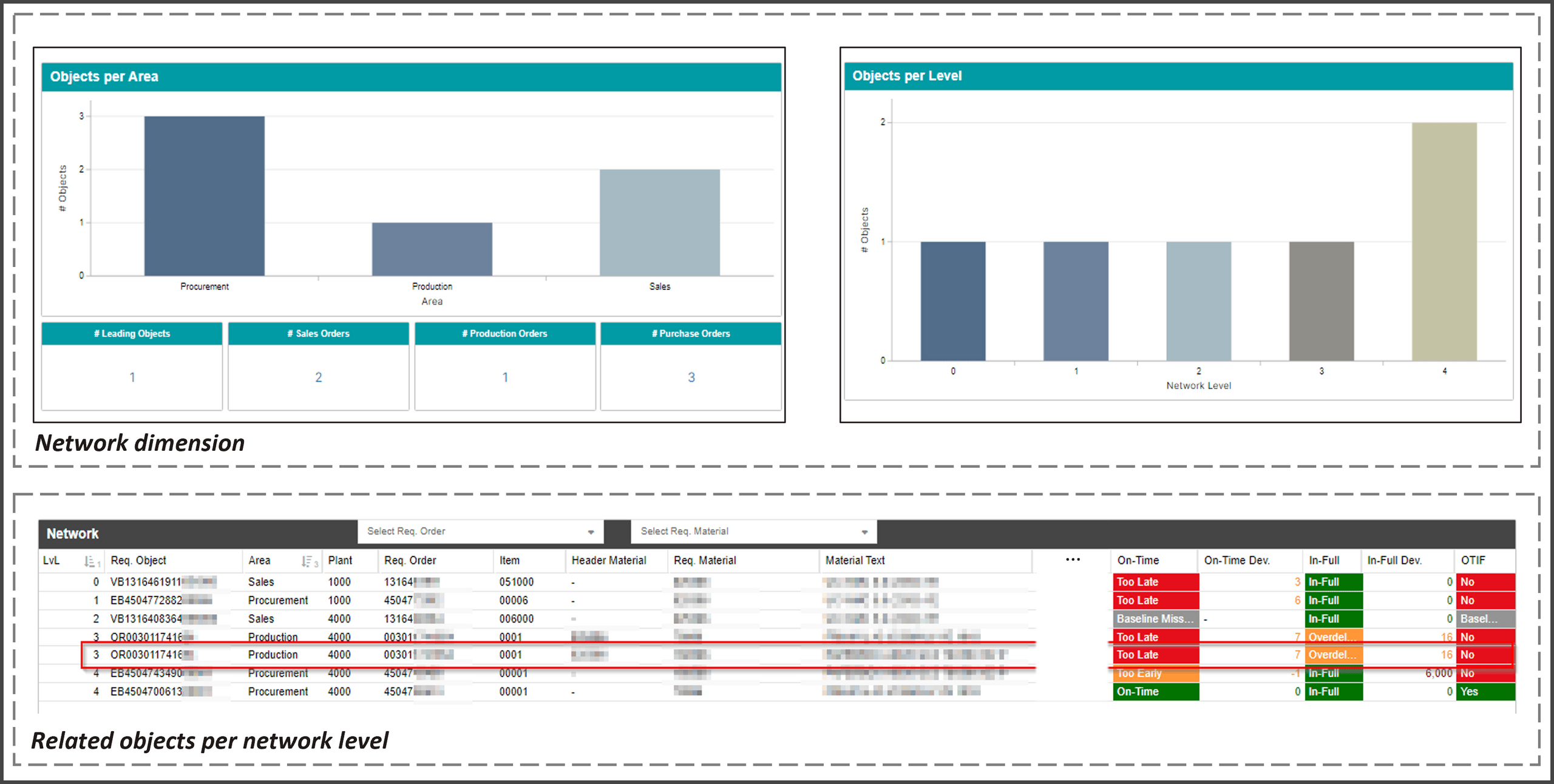 Ursachen für OTIF-Abweichungen innerhalb der Lieferkette beziehungsweise des Netzwerks können mit dem Network Root Cause Analyzer identifiziert werden. Dabei lassen sich Verzögerungen entlang der Belegketten nachvollziehen, die Vertrieb, Produktion und Beschaffung umfassen. Das Modul bietet eine mehrstufige Ansicht des Lieferkettennetzwerks, stellt Auftragsbeziehungen im Detail dar und zeigt auf, wo genau Engpässe bestehen.