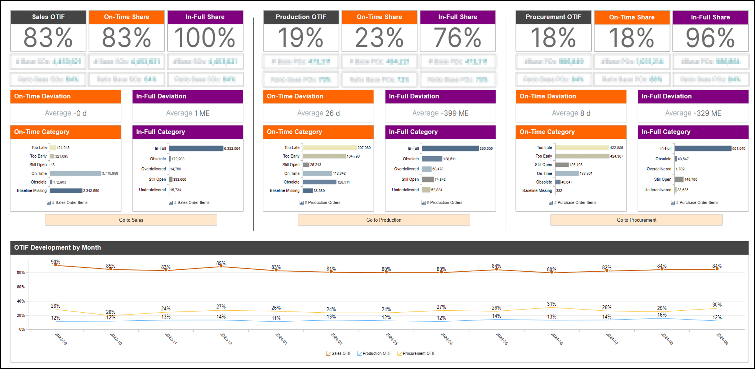 Das Dashboard für die Produktion gibt einen Überblick über die OTIF-Leistungsanalyse.