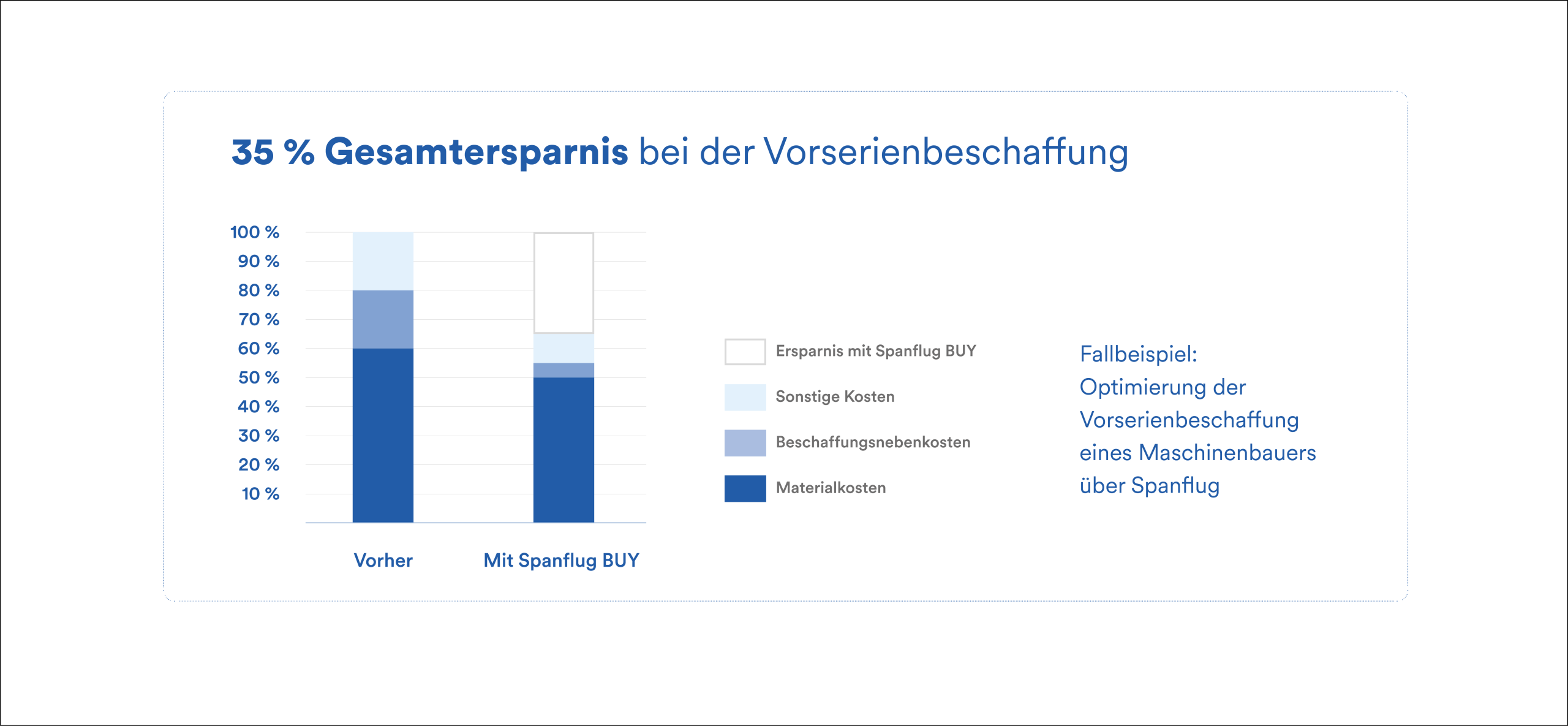 Spanflug BUY ermöglicht es, den Aufwand für die Beschaffung um bis zu 90 % zu reduzieren und individuelle Fertigungsteile mit wenigen Klicks zu bestellen. Zusätzlich ermittelt die Spanflug-Plattform automatisch die wirtschaftlichste Fertigungsmöglichkeit und ermöglicht dadurch weitere Kosteneinsparungen. ​Insgesamt lassen sich die Gesamtkosten um bis zu 35 % senken.